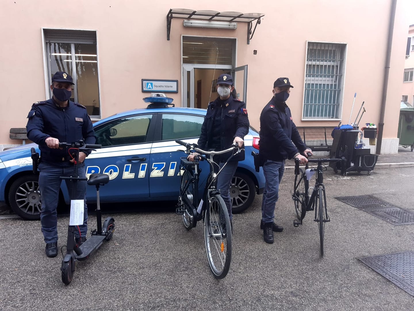 Su segnalazione al 113 di persone sospette in un condominio di via Tavo, a Pescara, la Squadra Volante, giunta immediatamente sul posto, ha notato un uomo che, accortosi della pattuglia, ha cercato di eludere il controllo entrando in uno degli appartamenti. Fermato e identificato per A.B., 36enne cittadino kosovaro, in possesso di regolare permesso di soggiorno, gli operatori hanno accertato che era in possesso di un monopattino elettrico del valore di circa 500euro che, per sua ammissione, aveva comprato da un nordafricano pagandolo 20euro. I poliziotti hanno perquisito la sua abitazione rinvenendo un altro monopattino elettrico del valore di 500euro, una bici elettrica, una bicicletta sportiva ed uno smartphone dei quali il perquisito non è riuscito a documentare la lecita provenienza.