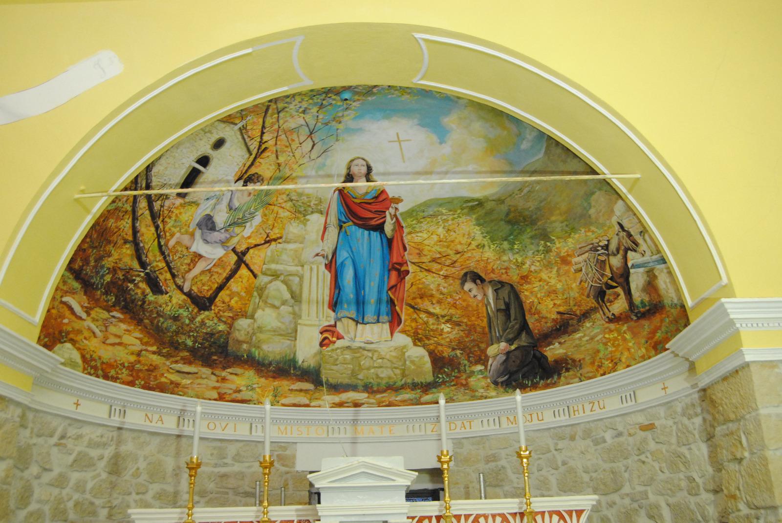 È un’opera realizzata direttamente sulla superficie muraria, con colori acrilici all’acqua. Resisterà nel tempo salvo distacco di intonaco dovuto a calamità naturali o altro. Sul pavimento in cotto è stata incisa una piccola croce greca, che vuol essere il punto focale per osservare l’opera parietale senza le deformazioni curve della superficie e di alcuni impedimenti quali il tirante strutturale e il sottile filo della campana. L’opera può iniziarsi a leggere dal punto centrale, ovvero l’apparizione della Santa sui resti di una antica costruzione religiosa, molto probabilmente eretta dai profughi Dalmati.