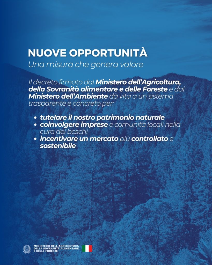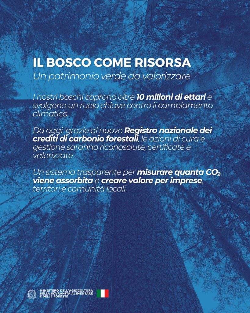Con il decreto firmato dal Ministero dell’Agricoltura, della Sovranità alimentare e delle Foreste e dal Ministero dell’Ambiente nasce il Registro nazionale dei crediti di carbonio forestali, un sistema che premia chi tutela e gestisce in modo virtuoso il patrimonio verde italiano.
