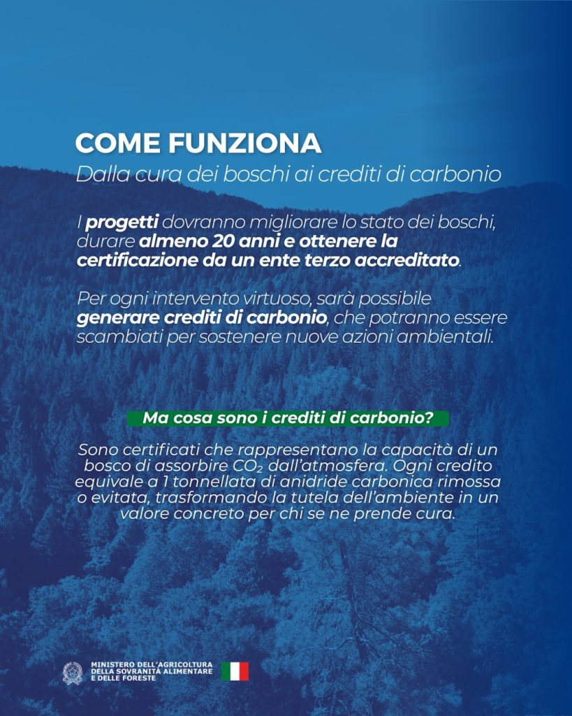 Le azioni di cura e miglioramento dei boschi potranno essere certificate e trasformate in crediti di carbonio, creando nuove opportunità per imprese, comunità locali e proprietari forestali.