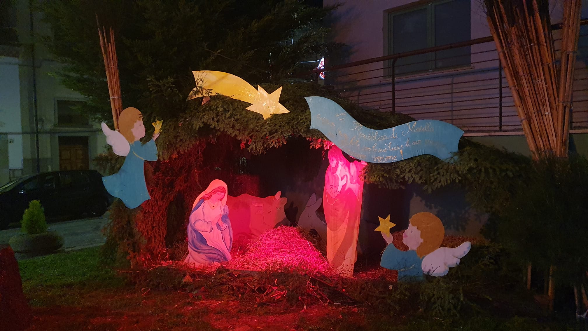 Un presepe simbolo di rinascita e di buon auspicio per l’anno che verrà. E’ quello allestito dai ragazzi dell’associazione “La Repubblica di Maiella” nella villetta adiacente il polo scolastico dell’istituto omnicomprensivo “Giuseppe Nicola D’Agnillo”. Gli elementi del presepe sono stati realizzati con materiali poveri e a grandezza naturale. A riguardo i soci dell’associazione ringraziano di cuore per la collaborazione dimostrata Nietta e Linda Cerimele, mentre per l’allestimento delle luminarie i signori Clemente Zarlenga, Pietro Di Ciocco e Franco Mastrostefano. Nelle prossime settimane il presepe, illuminato anche di notte, sarà benedetto dal parroco della parrocchia.