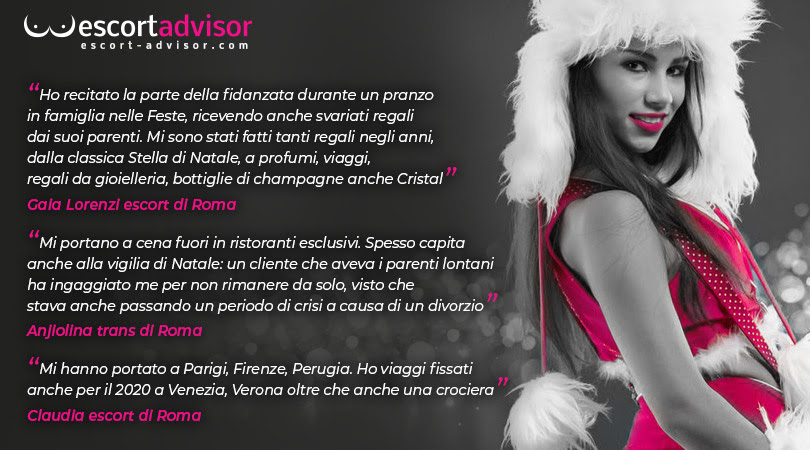 Sono molti anche gli uomini che festeggiano con le escort il Natale “postumo”: dopo il 25 e 26 passati in famiglia, con la scusa di dover andare un giorno almeno a lavorare in ufficio fra Natale e Capodanno, dedicano in realtà un giorno di ferie, che ovviamente hanno già preso, per festeggiare “privatamente” con un lungo appuntamento di oltre un’ora con la loro escort preferita, a volte unendo un pranzo o una gita all’incontro vero e proprio.