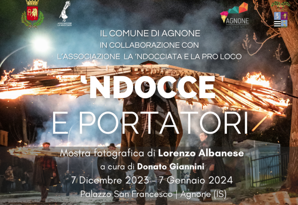 ‘Ndocce e portatori’ è questo il titolo della mostra fotografica organizzata da Comune e Pro loco di Agnone, in collaborazione con l’Associazione la Ndocciata con il patrocinio della Provincia di Isernia. Si tratta di un reportage del fotografo molisano Lorenzo Albanese curato dal giornalista Donato Giannini.