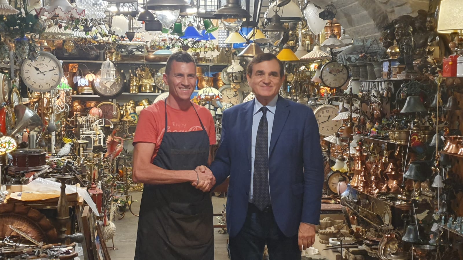 Aldo Patriciello nella storica bottega artigianale dei D’Aloise. A conclusione dell’incontro avuto con la ministra Mara Carfagna, l’europarlamentare di Forza Italia è stato immortalato a fare compere in una delle più originali attività commerciali di corso Vittorio Emanuele, quella appunto de “Ru Cavalier”, famiglia di artigiani che da anni realizza bilance e si tramanda l’ingegno della lavorazione del rame.