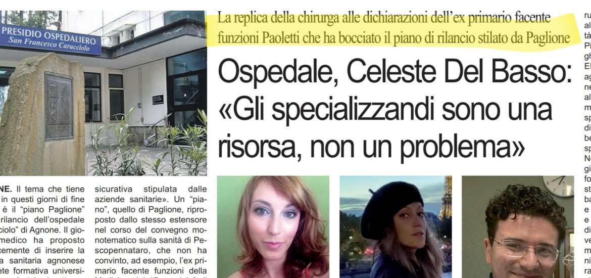Un “piano”, quello di Paglione, riproposto dallo stesso estensore nel corso del convegno monotematico sulla sanità di Pescopennataro, che non ha convinto, ad esempio, l’ex primario facente funzioni della Medicina del “Caracciolo”, il dottore Franco Paoletti. Il noto reumatologo ha bocciato senza appello la proposta del giovane collega, con toni a tratti di dura critica anche personale all’indirizzo del dottore Paglione. A controbilanciare la stroncatura arrivata da Paoletti, che è anche consigliere comunale di minoranza in Agnone, si registrano ora gli interventi di altri due camici bianchi. La dottoressa Celeste Del Basso, chirurga ad indirizzo oncologico in Piemonte, ad esempio, replica alle dichiarazioni trancianti del collega Paoletti in questi termini: «Gli specializzandi non sono “sostituti a basso costo” degli specialisti, ma giovani medici che, specie se assunti con il Decreto Calabria, svolgono attività assistenziali proporzionate al livello di competenze e autonomia raggiunto. Sono sempre inseriti in un percorso di tutoraggio e supervisione, ma ciò non significa che non possano coprire turni, anche notturni, come già avviene in moltissimi ospedali italiani: in questi casi è previsto un medico strutturato reperibile, pronto a intervenire in caso di necessità».