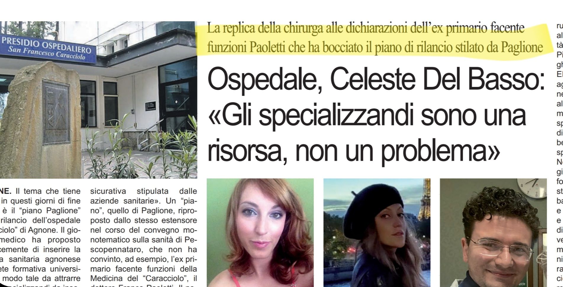 Il tema che tiene banco, in questi giorni di fine estate, è il “piano Paglione” per il rilancio dell’ospedale “Caracciolo” di Agnone. Il giovane medico ha proposto semplicemente di inserire la struttura sanitaria agnonese nella rete formativa universitaria in modo tale da attrarre medici specializzandi da inserire immediatamente in organico, spedendoli nei reparti. Una eventualità resa possibile dal decreto Calabria e già utilizzata con successo negli ospedali abruzzesi.