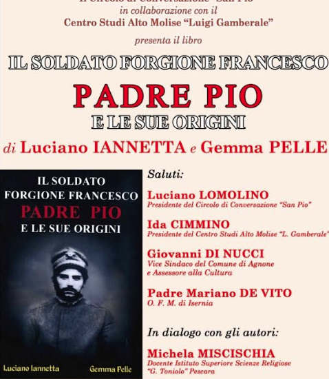 Il Centro Studi Alto Molise, in collaborazione e con il Circolo di Conversazione “San Pio” invita la cittadinanza e chiunque fosse interessato alla presentazione del libro “Il soldato Forgione Francesco Padre Pio e le sue origini” di Luciano Iannetta e Gemma Pelle. Ne parlerà con gli autori Michela Miscischia, docente dell’Istituto di Scienze Religiose “G. Toniolo” di Pescara.