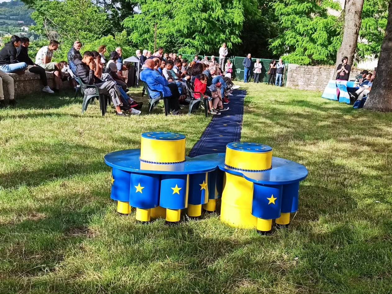 Una panchina, ma anche un’opera d’arte, con i colori e le insegne dell’Europa unita, realizzata dal poliedrico Mario Catolino, utilizzando tra l’altro solo materiale riciclato. L’occasione ha rappresentato un bellissimo momento di confronto, tra generazioni e culture diverse, sul significato e l’identità della Unione Europea. La panchina, su volontà dell’amministrazione comunale di Agnone, presenti oltre al sindaco anche le assessori Amalia Gennarelli ed Enrica Sciullo, è stata intitolata alla memoria di Altiero Spinelli e «rappresenterà uno stimolo di riflessione sull’essenza del progetto politico proposto nelle pagine del Manifesto di Ventotene: quello degli Stati Uniti d’Europa, di cui la nostra Unione Europea è premessa storia».