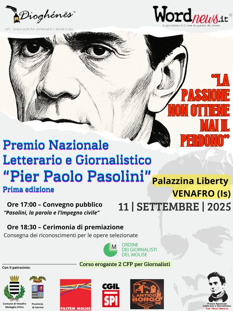 L’11 settembre Venafro ospiterà la prima edizione del Premio Nazionale Letterario e Giornalistico “Pier Paolo Pasolini”, ideato dall’Associazione Dioghenes APS in collaborazione con la testata WordNews.it. Una giornata densa di contenuti e di memoria attiva, con protagonisti esponenti del mondo della magistratura, del giornalismo investigativo, della ricerca storica, dell’editoria e della società civile.