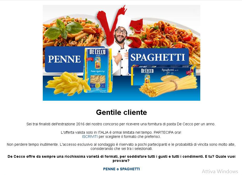 Decine, forse centinaia di utenti del web stanno ricevendo in questi giorni una email, da un improbabile indirizzo (binh@railroad.bustedpin.com), che promette di far vincere una fornitura annuale di pasta in cambio della partecipazione ad un sondaggio.