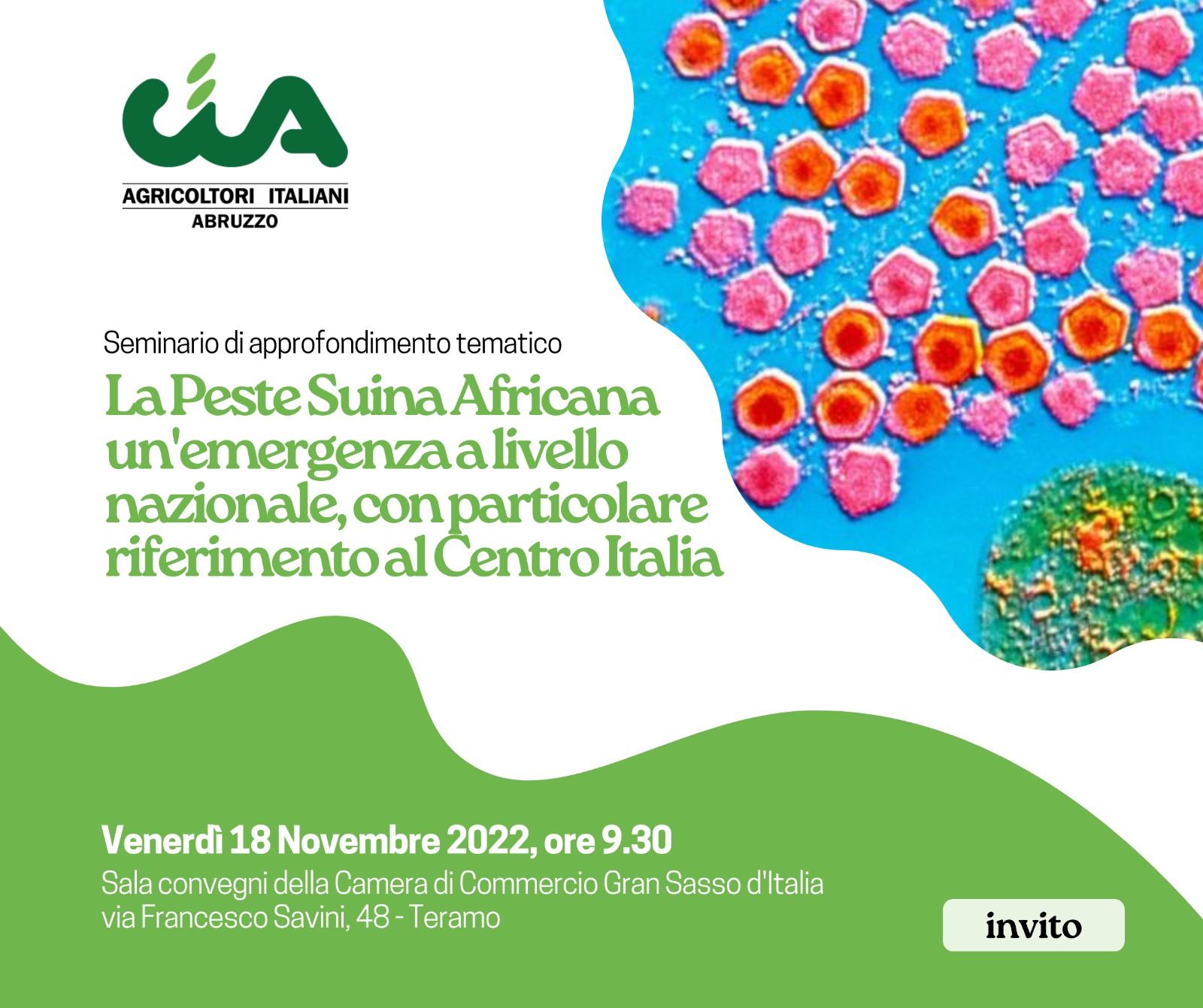 Si terrà venerdì 18 novembre 2022 alle ore 9:30 presso la Sala convegni della Camera di Commercio Gran Sasso d’Italia, via Francesco Savini 48, a Teramo, una giornata informativa sulla peste suina africana organizzata da Cia Abruzzo. Conoscere e approfondire il tema permette, se necessario, tempestività e immediatezza nel porre in essere contromisure incisive ed evitare i danni conseguenti. Dopo l’apertura dei lavori affidata al Presidente Cia Abruzzo, Nicola Sichetti, seguiranno le relazioni e gli interventi degli esperti in materia. Interventi istituzionali dell’Assessore regionale alla Sanità, Nicoletta Verì e dell’Assessore regionale all’Agricoltura, Emanuele Imprudente