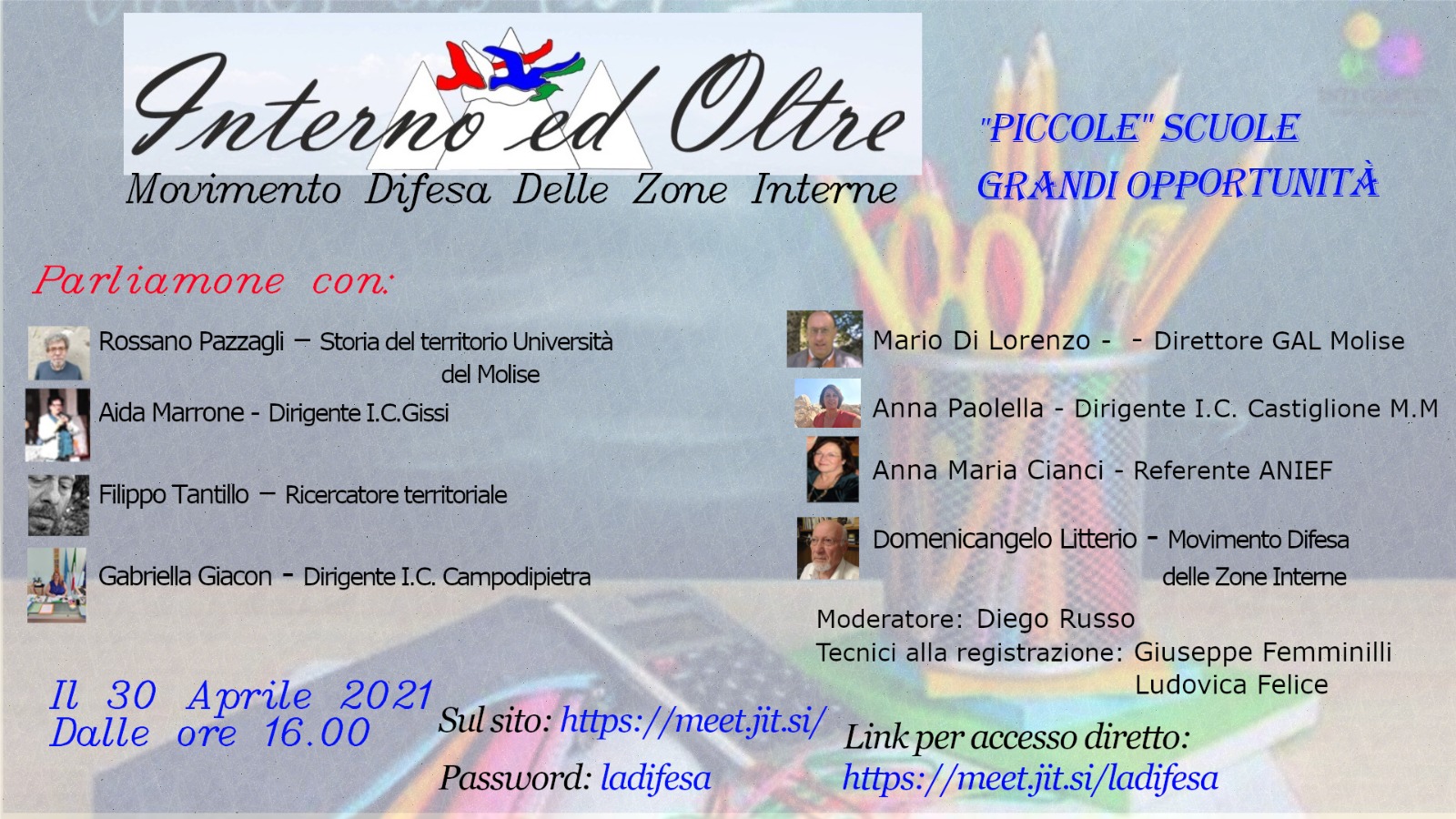L’evento culturale vedrà come relatori Rossano Pazzagli, docente dell’Università del Molise, Aida Marrone, dirigente scolastica nel confinante Vastese, Filippo Tantilo, ricercatore territoriale, Gabriella Giacon, dirigente scolastica a Campodipietra, Mario Di Lorenzo, direttore del Gal Molise, Anna Paolella, molisana ma dirigente dell’istituto comprensivo di Castiglione Messer Marino, Anna Maria Cianci, referente Anief e ovviamente Domenicangelo Litterio in qualità di portavoce del Movimento. Modera il dibattito Diego Russo, con al collaborazione alla regia di Giuseppe Femminilli e Ludovica Felice. L’appuntamento è per oggi pomeriggio, dalle ore 16, sul link https://meet.jit.si/ladifesa. La password per accedere al lavori è: ladifesa.