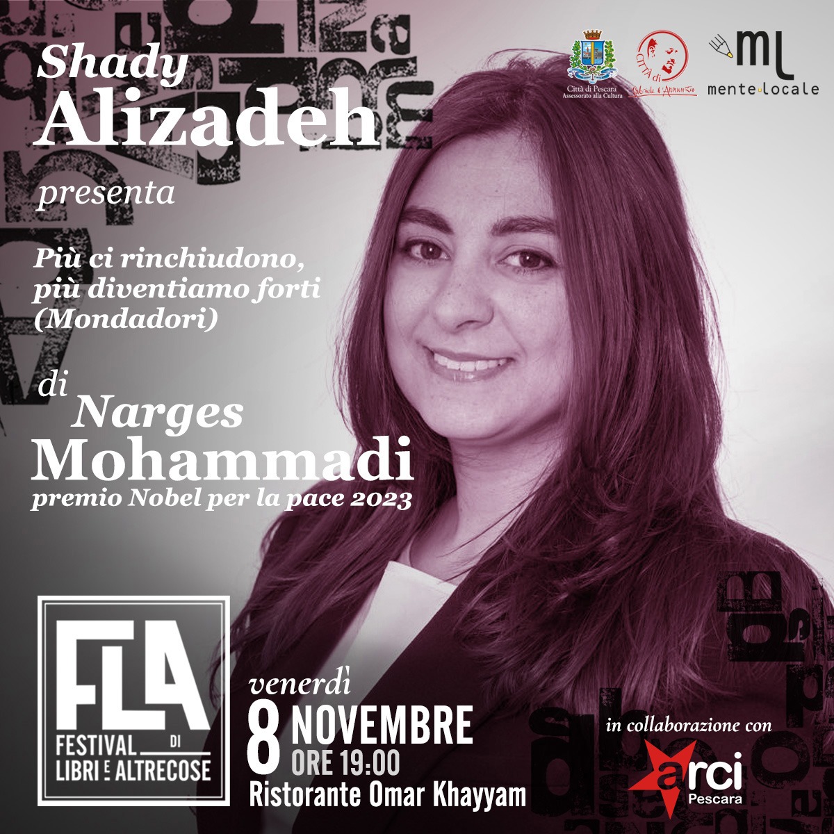 Oggi pomeriggio alle 19, nell’ambito del FLA – Festival di Libri e Altrecose, al ristorante iraniano Omar Khayyam in via delle Caserme 53, Shady Alizadeh, leader italiana del movimento “Donna, Vita, Libertà”, presenterà “Più ci rinchiudono, più diventiamo forti” di Narges Mohammadi. Dialogherà con lei Claudio Mastrangelo, di ARCI Pescara.