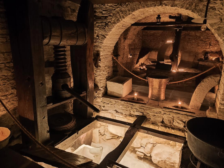 Il Frantoio ipogeo rappresenta forse la sorpresa più affascinante. Scavato nelle viscere del palazzo durante l’epoca medievale, questo esempio unico di archeologia industriale racconta di un tempo in cui l’olio d’oliva era oro liquido e la sua produzione un’arte tramandata di generazione in generazione.