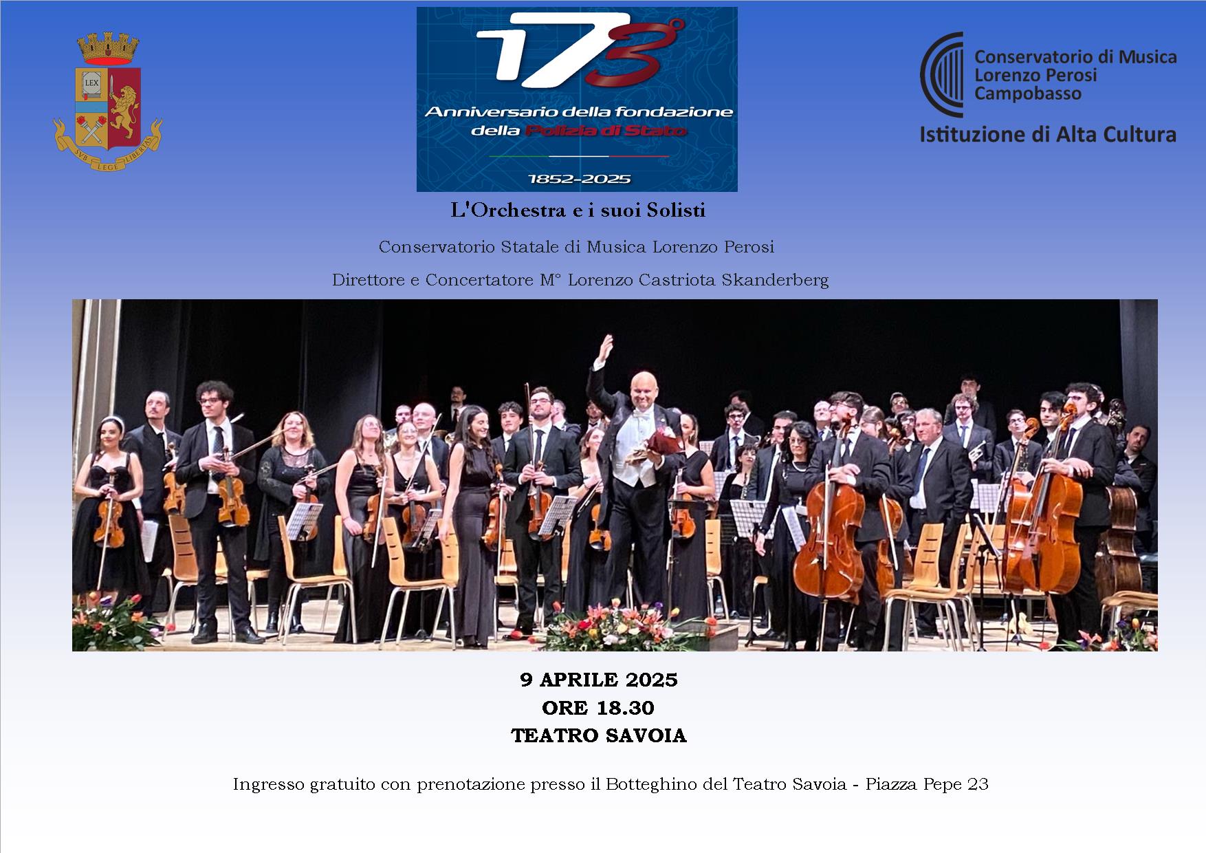 In occasione delle celebrazioni del 173° Anniversario della Fondazione della Polizia di Stato, il prossimo 9 aprile alle ore 18.30, giornata che precede la ricorrenza, al Teatro Savoia di Campobasso si esibirà in concerto il Conservatorio “Lorenzo Perosi”.