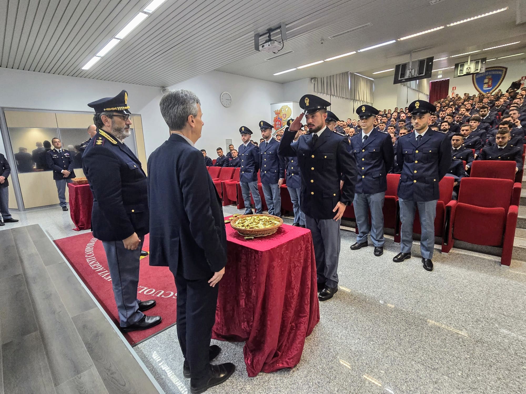 Oggi, presso l’Aula Magna della Scuola Allievi Agenti “Giulio RIVERA” di Campobasso, 204 giovani frequentatori del 225° Corso di Formazione, conseguendo la qualifica di Agenti in Prova della Polizia di Stato, hanno ricevuto gli alamari dal Questore della Provincia di Campobasso Cristiano TATARELLI e dal Direttore della Scuola Primo Dirigente Dr. Giovanni NUNZIATA.