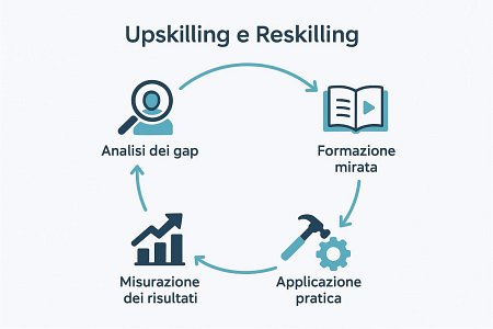 Nessuna azienda deve formarsi su “tutto il digitale”. L’obiettivo è selezionare le competenze più rilevanti per il business oggi e nei prossimi cinque anni, costruendo percorsi formativi coerenti. La scelta deve tenere conto dei bisogni futuri dell’organizzazione e bilanciare upskilling — rafforzare competenze già presenti per far evolvere il ruolo — e reskilling — acquisire competenze nuove quando il ruolo cambia in modo significativo.