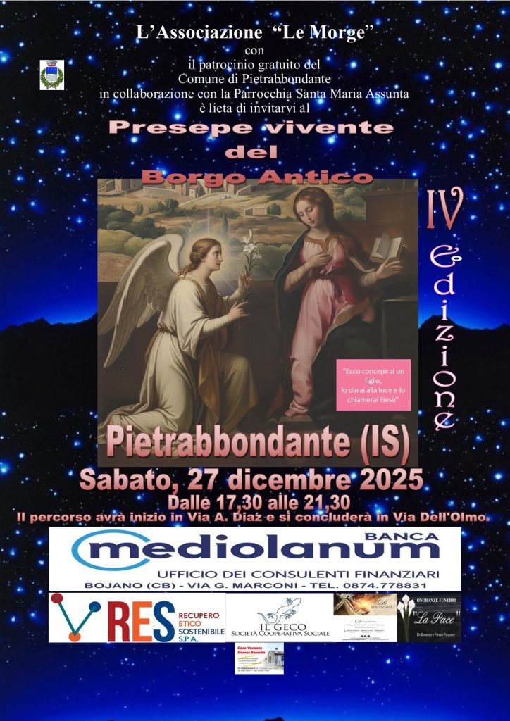 Torna il “Presepe Vivente del Borgo Antico”. L’evento, giunto alla quarta edizione, ha ottenuto il patrocinio dal Comune di Pietrabbondante ed è realizzato in collaborazione con la Parrocchia  Santa Maria Assunta.
