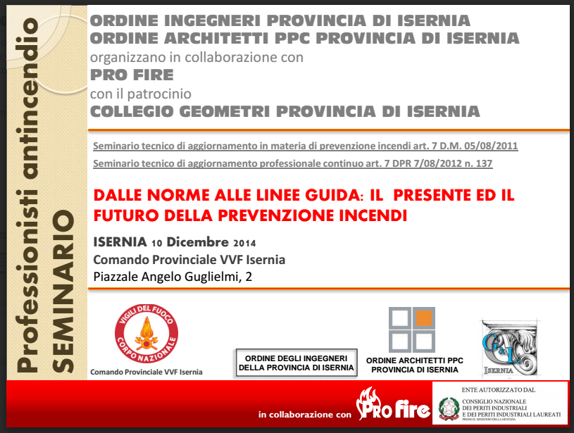 Il seminario si svolgerà dalle 15:00 alle 19:00 con il saluto del Direttore Regionale VVF del Molise e successivamente una serie di interventi tenuti da Dirigenti e Funzionari del CNVVF che illustreranno alcune regole tecniche emanate nel corso del 2014.