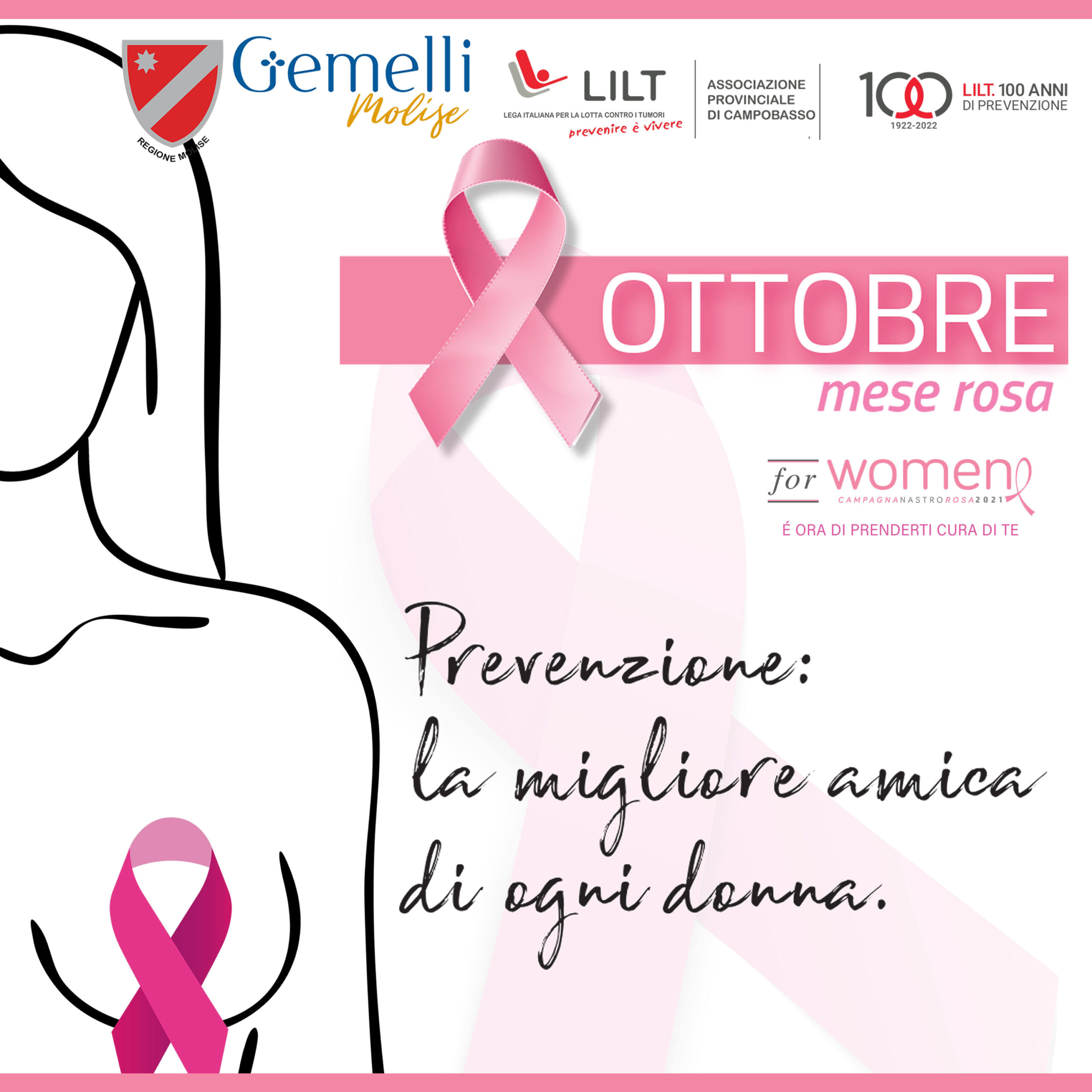 Anche quest’anno il Gemelli Molise ha aderito alla Campagna Nastro Rosa promossa dalla LILT. Domenica 30 ottobre 2022 sarà dedicata alla prevenzione del tumore con uno screening mammografico per le donne nella fascia d’età compresa tra 45 e 49 anni. Grazie alla sensibilità e disponibilità di Eleonora Cucci, Specialista in Radiologia Senologica, Francesco Palumbo, Chirurgo Senologo, Renato di Cerce, Chirurgo Senologo, Maria Cristina Masciotra, Specialista in Radiologia Senologica, che saranno saranno a disposizione per visite ed esami gratuiti a diverse pazienti che che nelle scorse settimane hanno già effettuato la prenotazione.