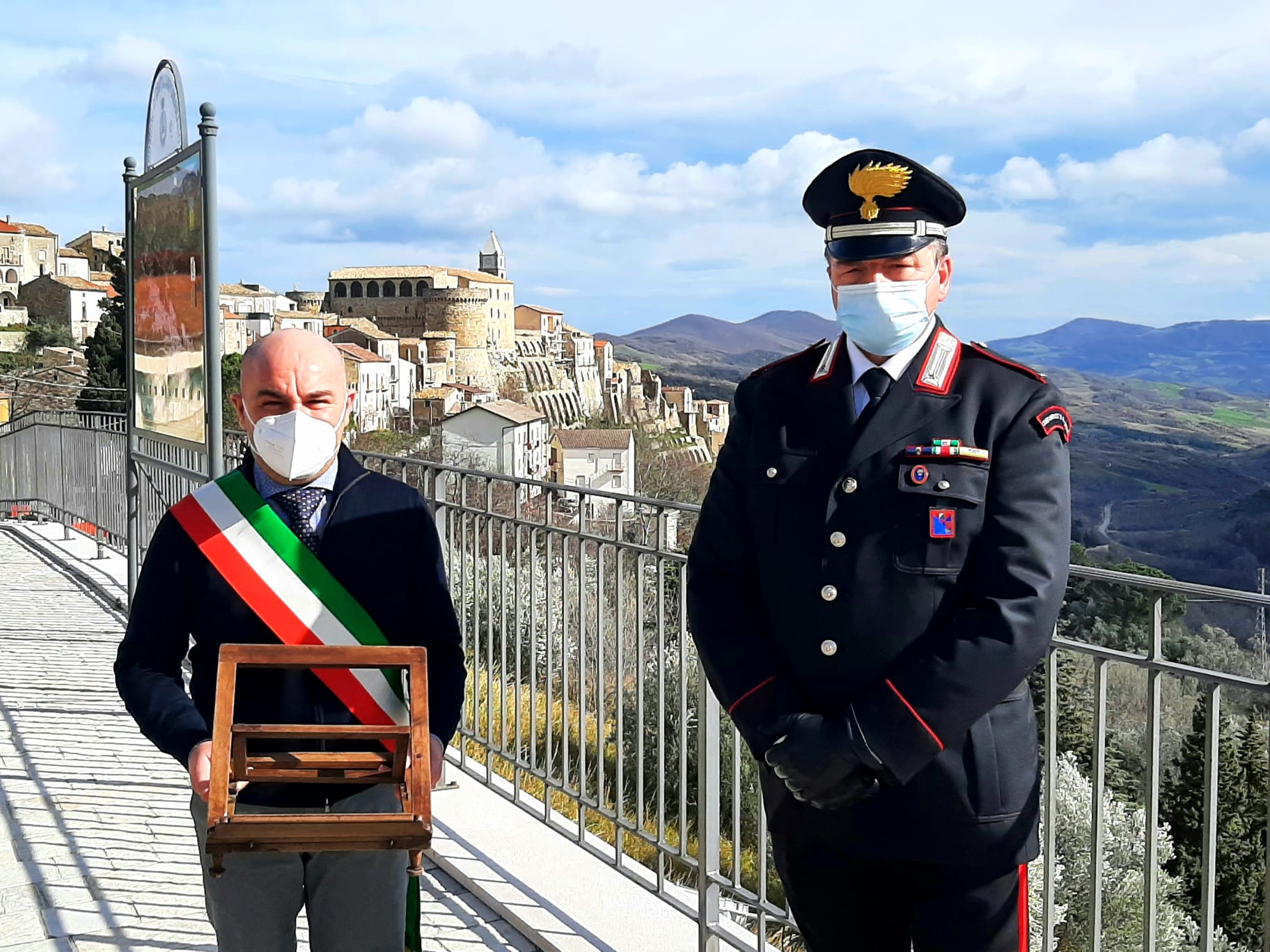 Il Comandante della Stazione dei Carabinieri di Civitacampomarano ha riconsegnato al Sindaco, Manuele Paolo, il leggio in legno. Il primo Cittadino, dal suo canto, ha ringraziato l’Arma dei carabinieri per il prezioso contributo e la costante attività quotidiana sul territorio donando, altresì, al Comandante Provinciale Carabinieri di Campobasso ed al Comandante della Compagnia Carabinieri di Larino un targa a nome dell’intera cittadinanza.