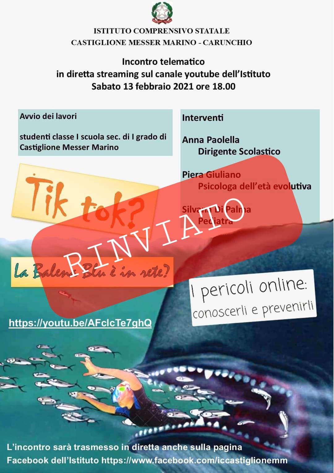Così la dirigente dell’istituto scolastico di Castiglione Messer Marino, Anna Paolella, comunica il rinvio della videoconferenza in programma per il pomeriggio di oggi in merito ai pericoli del web e dei social per i giovani e giovanissimi.
