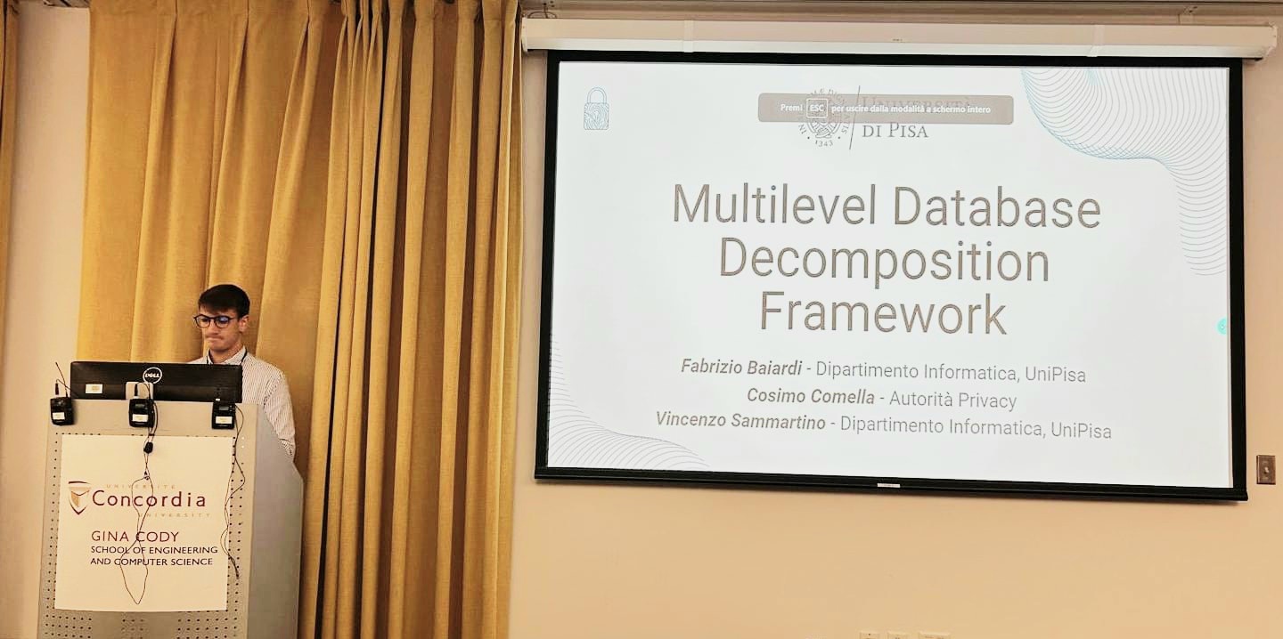 Ieri Vincenzo Sammartino ha presentato il suo lavoro dal titolo “Satisfying least privilege through database decomposition“, opera intellettuale e scientifica svolta in collaborazione col professor Fabrizio Baiardi dell’Università di Pisa e del dottor Cosimo Comella, Garante protezione dati personali.
