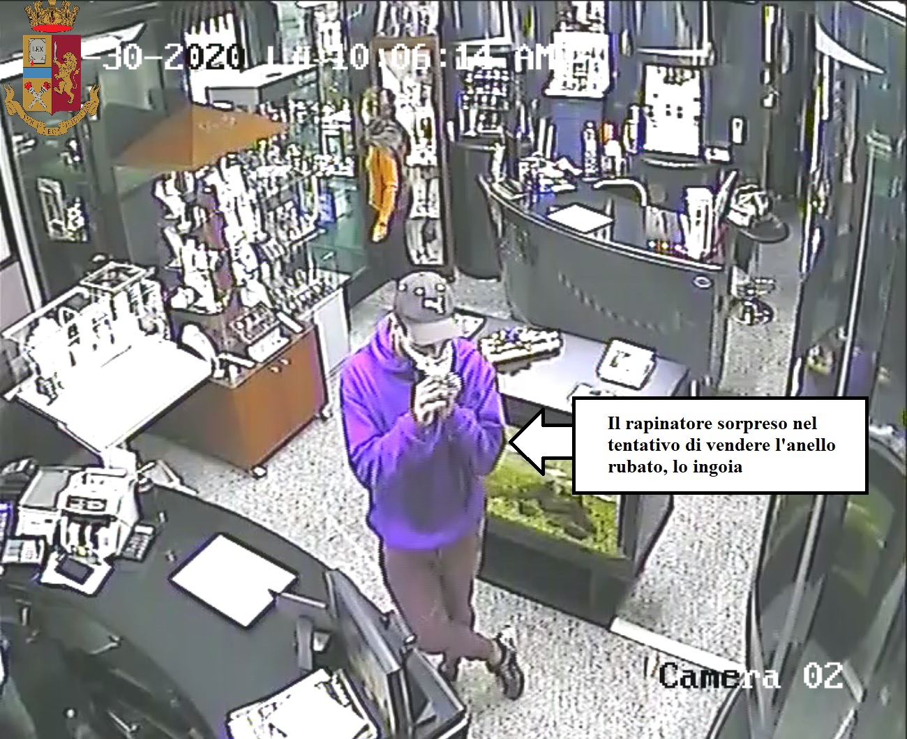 Nella circostanza la vittima, pur tentando di reagire, era stata sopraffatta dal giovane che, sempre sotto minaccia dell’arma, era riuscito a strappare dal dito dell’anziano un anello in oro, ferendolo alla mano sinistra. Subito dopo, il rapinatore si era dato alla fuga nelle vie del centro cittadino.