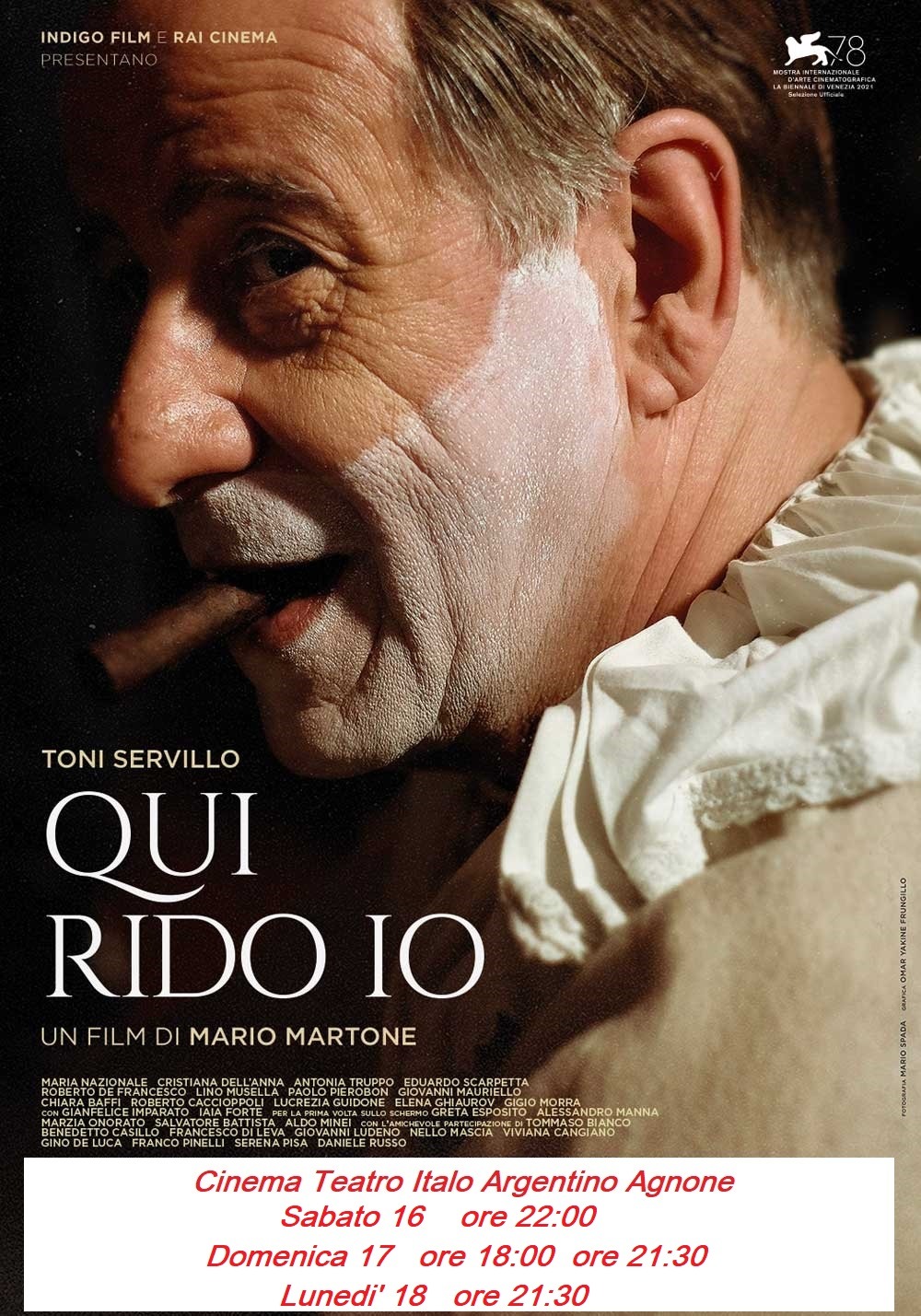 Il cinema d’autore all’Italo Argentino. Dopo aver ripreso la programmazione, l’associazione ‘Amici de l’Italo Argentino’, nel prossimo week-end, propone la pellicola protagonista alla mostra del cinema di Venezia ‘Qui rido io’, il film diretto da Mario Martone e incentrato sulla figura del celebre attore e commediografo Eduardo Scarpetta, interpretato da Toni Servillo, nonché padre di un altro grande del panorama teatrale italiano: Eduardo De Filippo.