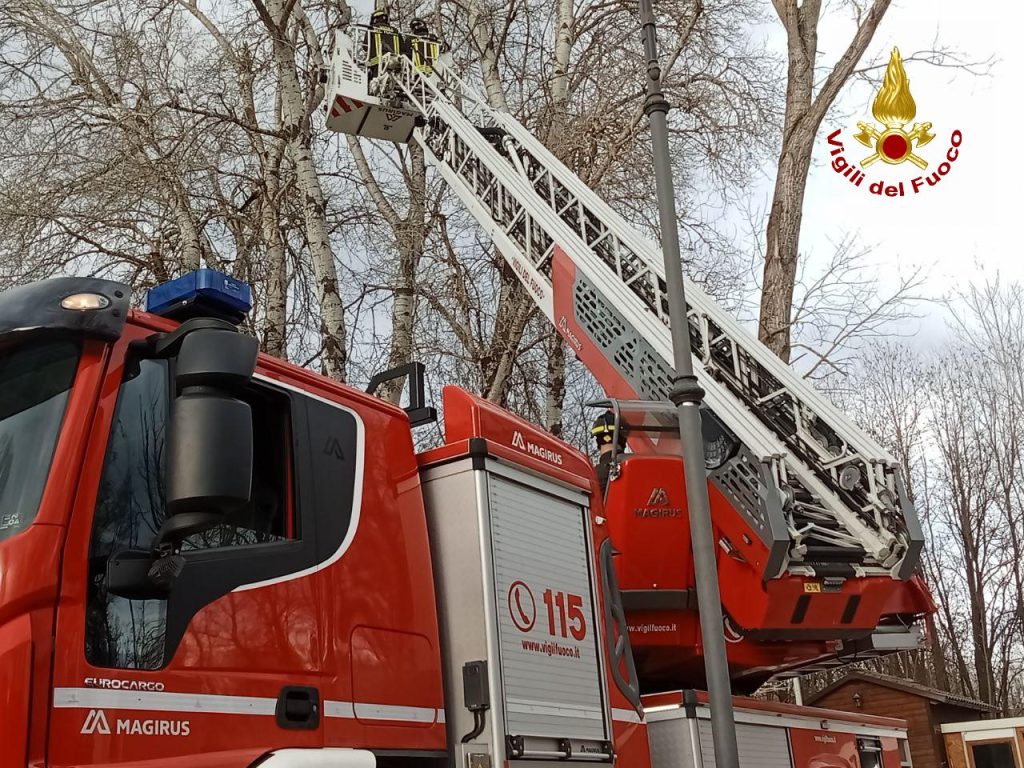 Il personale dei Vigili del Fuoco provvedeva a eliminare le parti in imminente rischio di caduta con l’ausilio dell’autoscala.