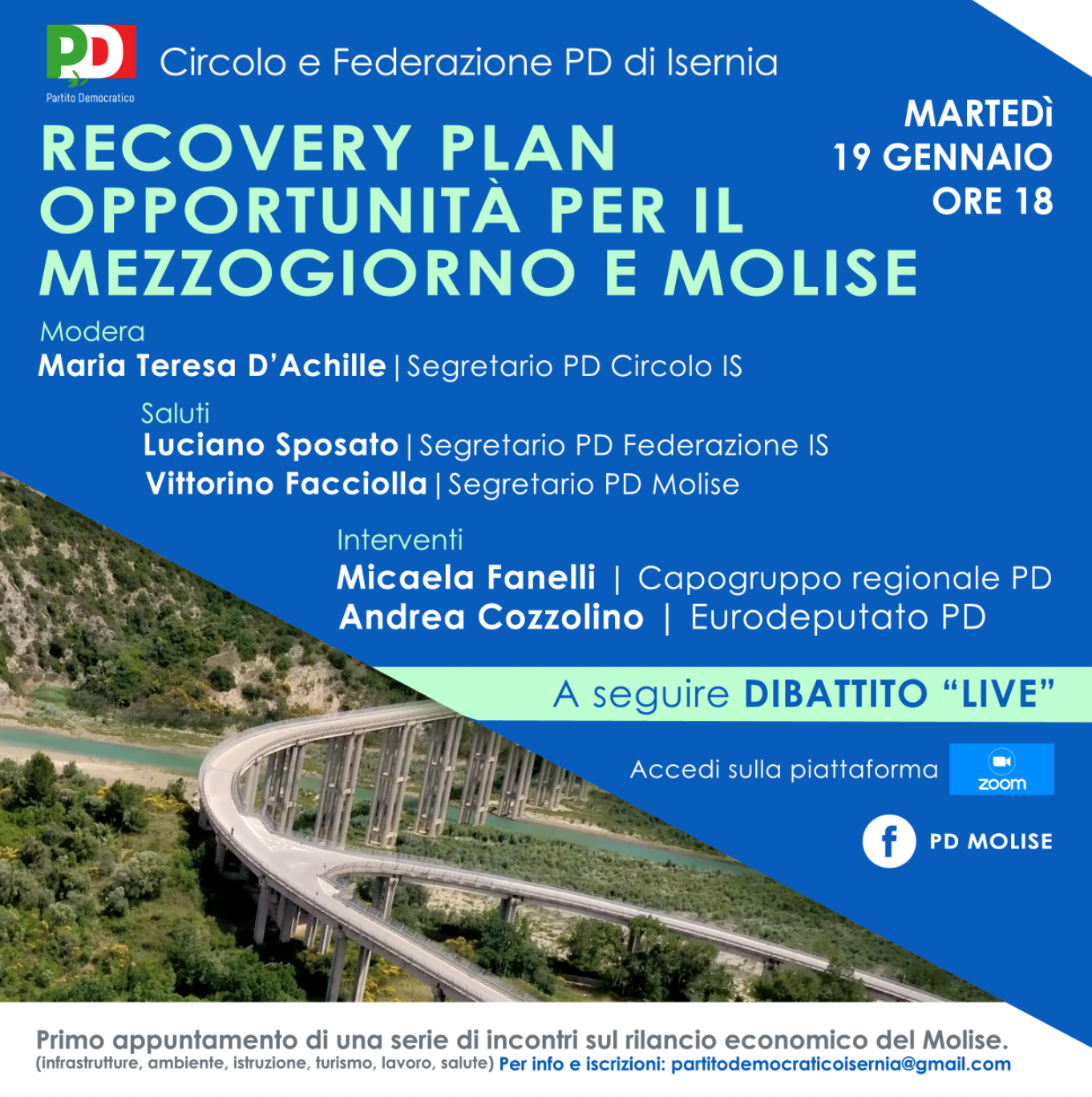 Recovery Plan, opportunità per il Mezzogiorno e il Molise: martedì 19 gennaio l’evento organizzato dal circolo del Partito Democratico di Isernia. Il rilancio dell’economia molisana attraverso le risorse previste dal Recovery Plan: se ne discuterà martedì 19 gennaio in diretta alle ore 18:00 sulla piattaforma Zoom del Partito Democratico di Isernia.