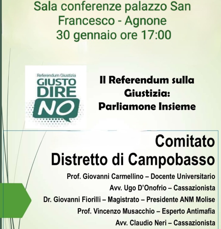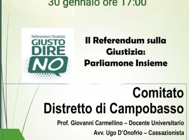 Questa sera (venerdì 30 gennaio), alle ore 17, nella Sala Consiliare di Palazzo San Francesco, si terrà l’incontro dal titolo “Il referendum sulla giustizia: parliamo insieme”, promosso dal comitato del “No”.
