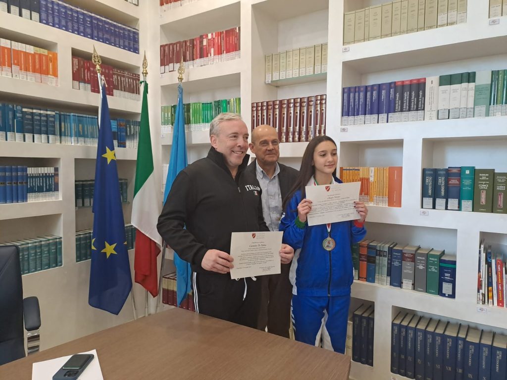 Analoga onorificenza è stata consegnata anche al coach Carmine De Palma per l’impegno profuso nell’allenare la giovane molisana, tanto da consentirle di raggiungere diversi traguardi prestigiosi nel mondo dello sport.