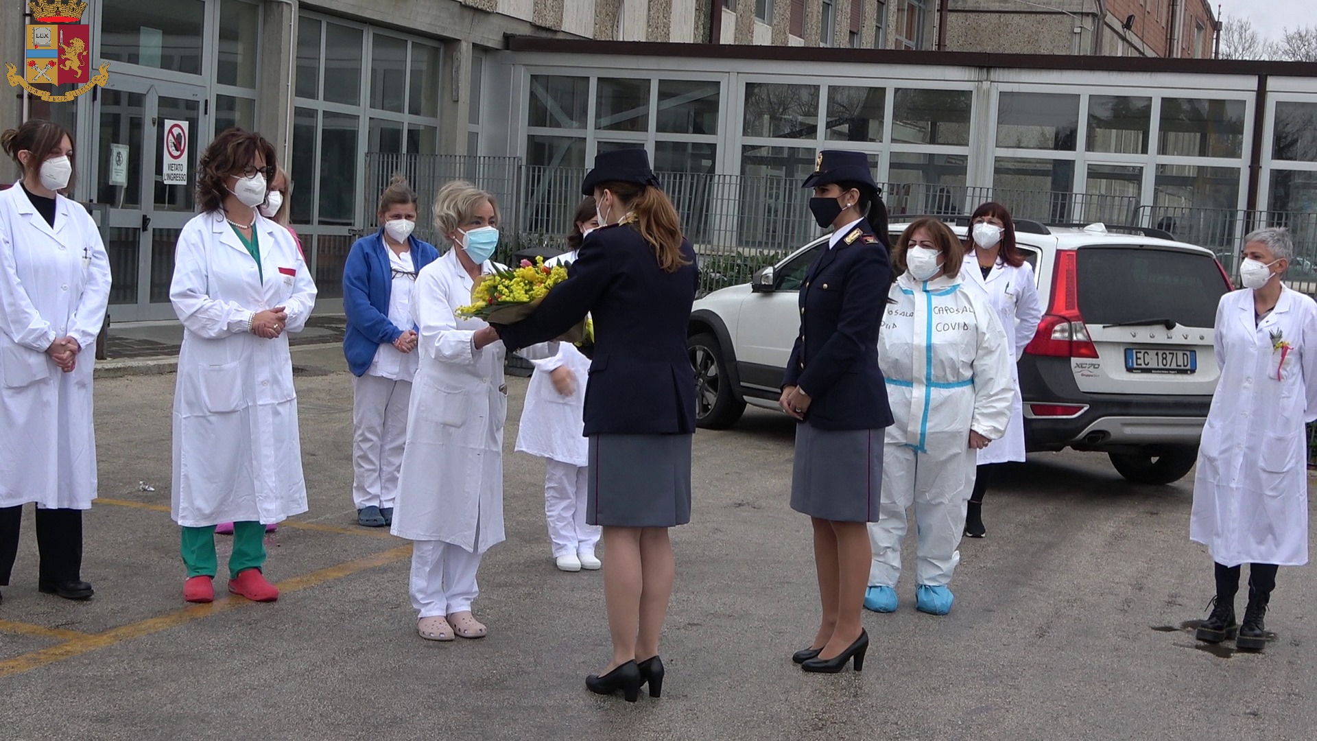 Nella mattinata di oggi, 8 marzo, in occasione della Giornata delle Donne, si è tenuto un momento di saluto all’esterno del locale ospedale civile “A. Cardarelli” rivolto alle operatrici del comparto sanitario da parte di un reparto schierato, al comando del V.Q.A. della Polizia di Stato dott.ssa Mariapia Sabelli, composto da personale femminile della Polizia di Stato, dell’Arma dei Carabinieri, della Guardia di Finanza, della Polizia Penitenziaria, dei Vigili del Fuoco e della Polizia Municipale di Campobasso, alla presenza dei rispettivi Comandanti e del Vicario del Prefetto dr. Pierpaolo PIGLIACELLI.