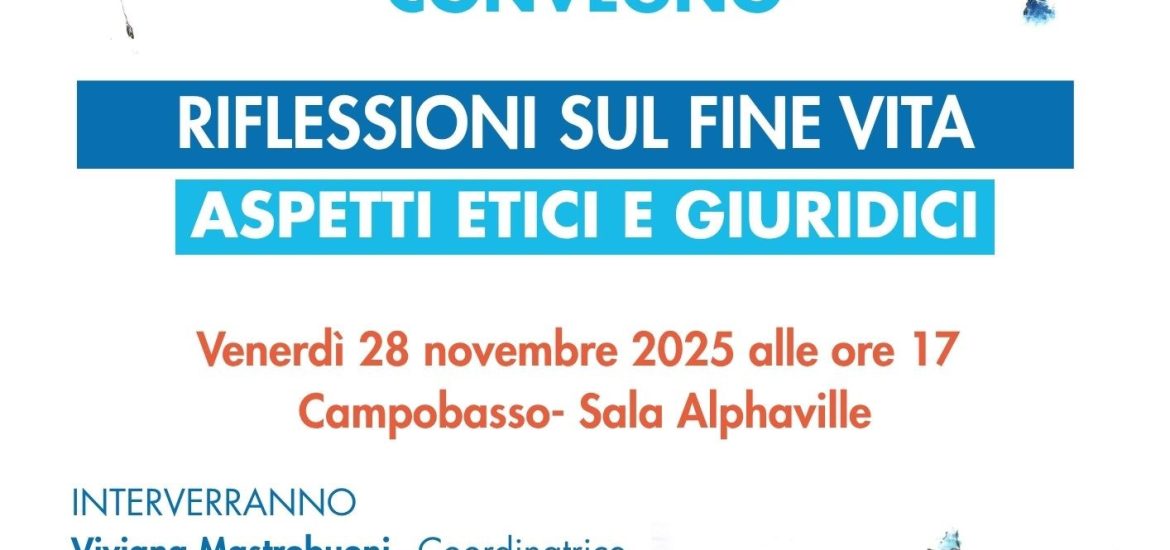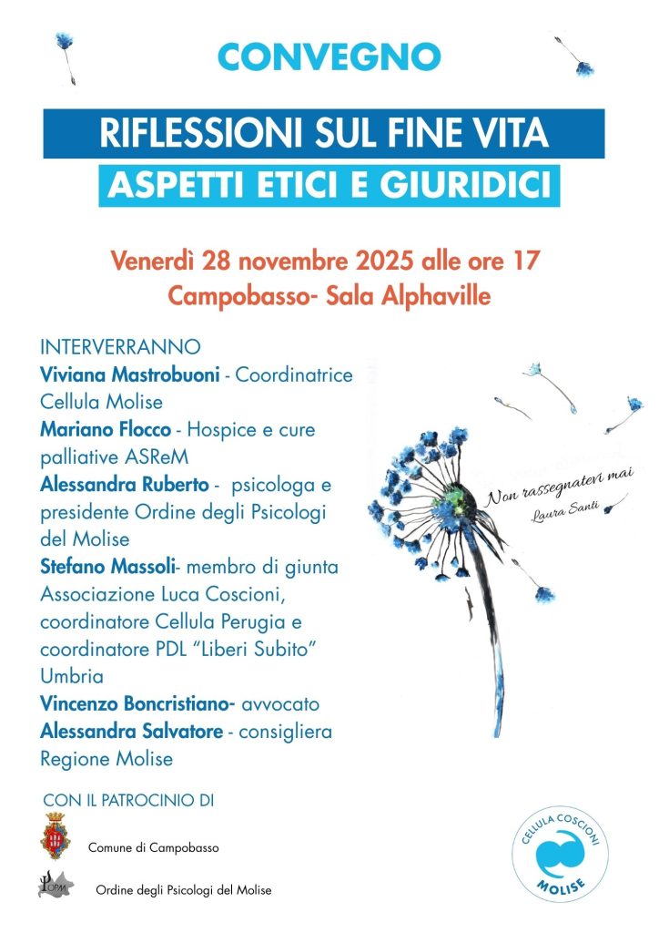 La Cellula Coscioni Molise organizza un Convegno dedicato alle complesse questioni legate al fine vita, in programma il 28 novembre alee ore 17 presso la Sala Alphaville in via Muricchio 1 a Campobasso.