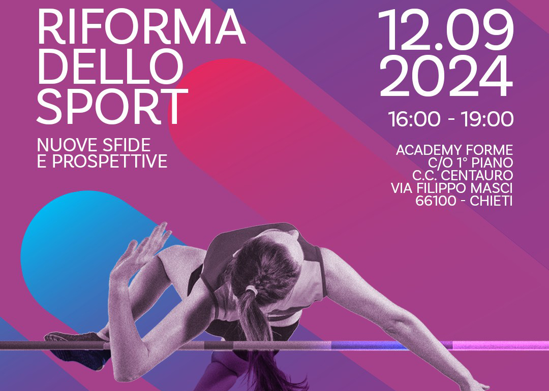 “Riforma dello sport – Nuove prospettive e sfide”: è il titolo dell’evento gratuito che si svolgerà giovedì 12 settembre, alle ore 16, nella sede di Academy ForMe, al primo piano del centro commerciale Centauro, in via Filippo Masci, a Chieti. L’iniziativa è promossa dalla categoria Sport di Confartigianato Chieti L’Aquila, dal Comitato provinciale ANCoS di Chieti e dal Coni di Chieti.