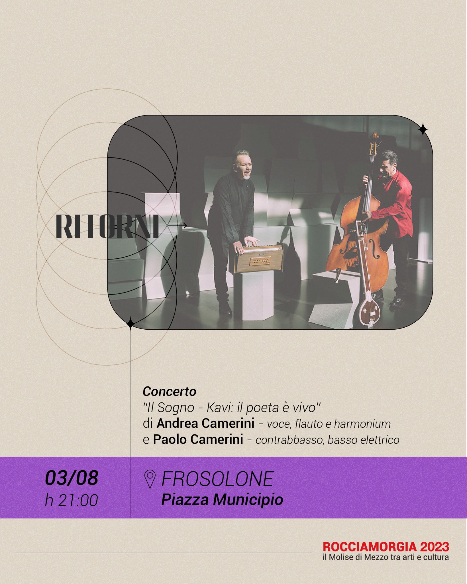 Dalle ore 21.00 spazio alla musica con il concerto “Il Sogno – Kavi: il poeta è vivo” di Andrea Camerini (voce, flauto e harmonium) e Paolo Camerini (contrabbasso, basso elettrico). A seguire “Il grido della fata” di Max Manfredi (voce e chitarra) con Alice Nappi (violino) e con la partecipazione di Ludovica Valori.