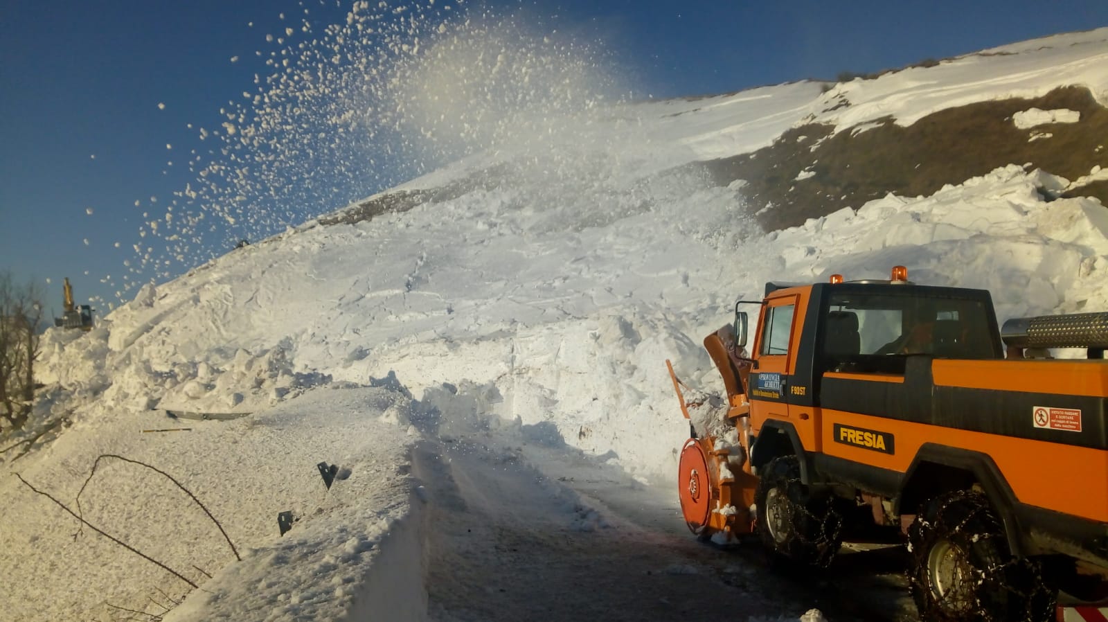 Ruspe e turbina contro la valanga: sospese le operazioni per riaprire la provinciale