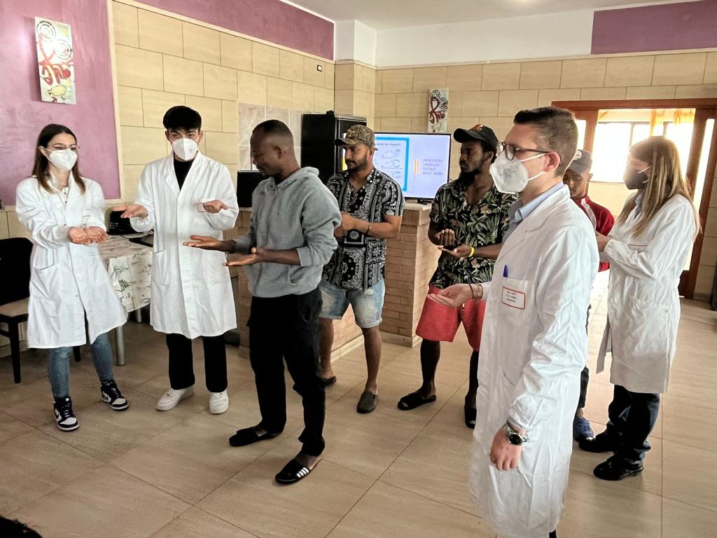 Gli studenti del II e III Anno Diego Camardo, Alessandra Monachetti, Alessio Pio Pistillo e Veronica Trave durante il tirocinio formativo si sono concentrati su Igiene Personale e dell’ambiente domestico. Il tutto è stato svolto, differenziando i destinatari, in base alla provenienza dei migranti ( Bangladesh, Pakistan, Senegal e India) e l’età (4 – 52 Anni) e superando le varie barriere culturali comunque presenti.