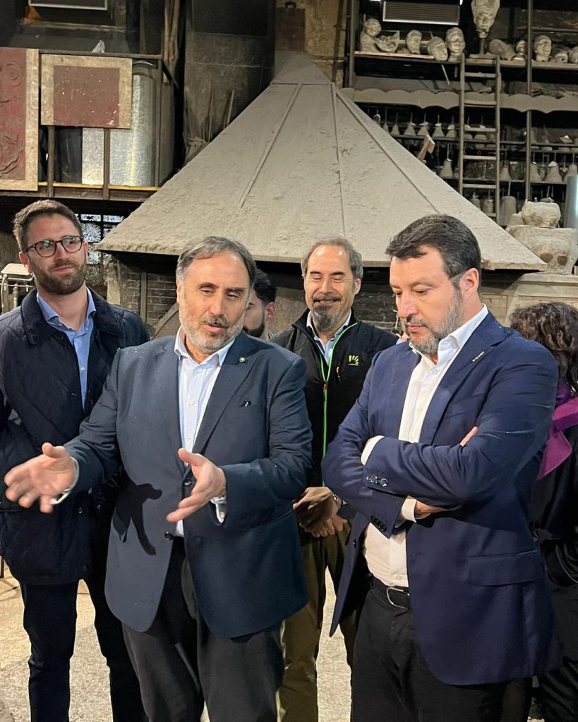 Non puoi andare ad Agnone e non passare a visitare la Pontificia fonderia Marinelli. E’ una legge non scritta che vale per tutti, anche per i Ministri della Repubblica. E il vice premier Matteo Salvini, dopo aver giurato che «il ponte Sente riaprirà nell’estate del 2024» proprio all’imbocco del viadotto, non si è sottratto a questo obbligo. Scortato dal codazzo di leghisti della prima e dell’ultima ora, il Ministro delle Infrastrutture e Trasporti è stato ricevuto ed accolto, con tutti gli onori del caso, dai fratelli Marinelli e dalle maestranze della fonderia tra le più antiche del pianeta.