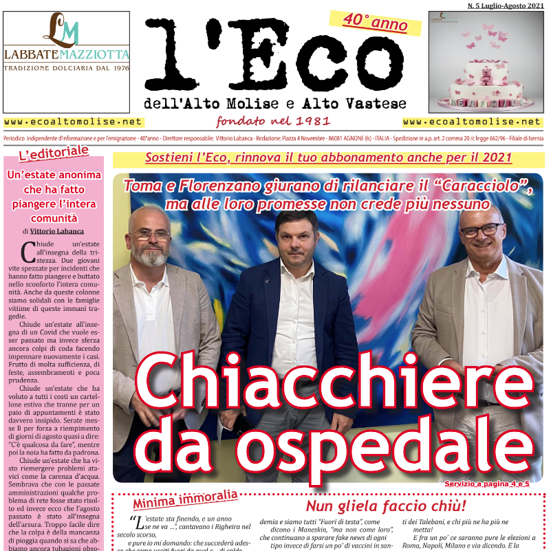 Insomma non resta che correre in edicola e acquistare una copia del cartaceo più longevo della regione al suo 40esimo anno di attività. Sostenere l’Eco significa sostenere la STAMPA LIBERA. Abbonati anche tu o acquista una copia, ci AIUTERAI A VIVERE!