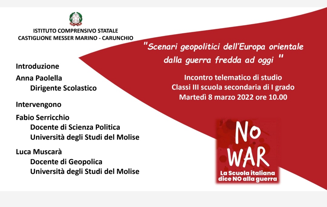 L’istituto scolastico di Castiglione Messer Marino promuove un incontro formativo riservato agli studenti delle classi III della scuola secondaria di I grado «per riflettere sugli eventi terribili di questi giorni e sulle loro radici storiche, geografiche e socioculturali». Ne dà notizia la dirigente scolastica, Anna Paolella.