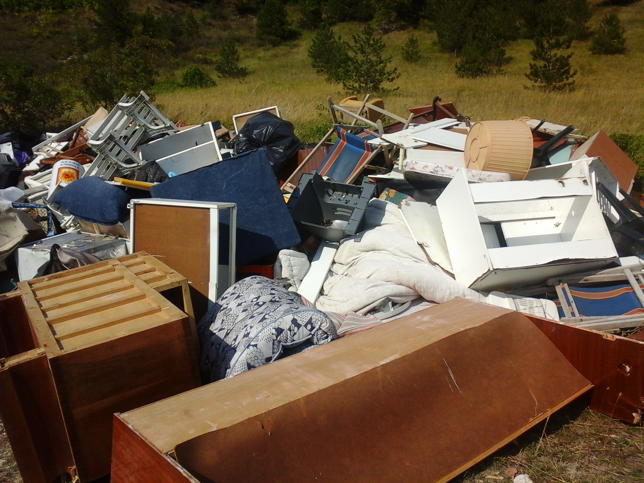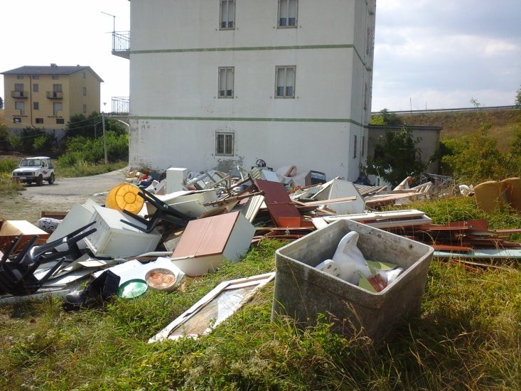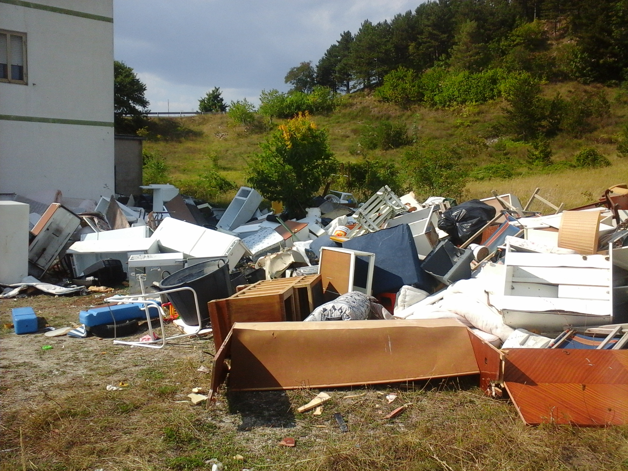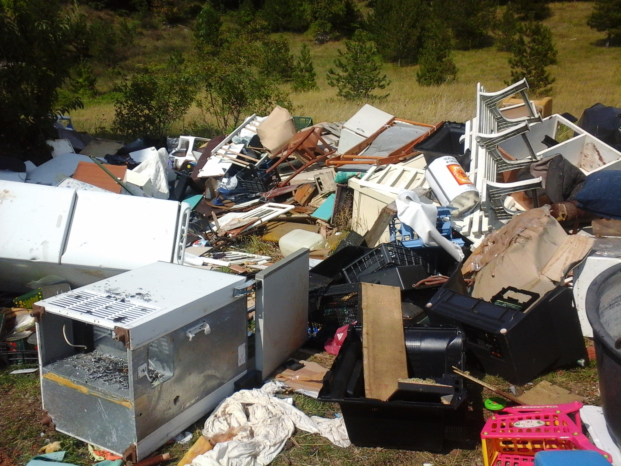 Rifiuti speciali e inquinanti, ingombranti, elettrodomestici, pneumatici, legno, vetro, plastica, materiale elettrico ed elettronico, di tutto, addirittura un grosso contenitore in eternit. Il tutto abbandonato nell’ambiente, ai piedi della pineta del Monte Pizzuto, accanto ad un fabbricato affittato al Comune da un privato.