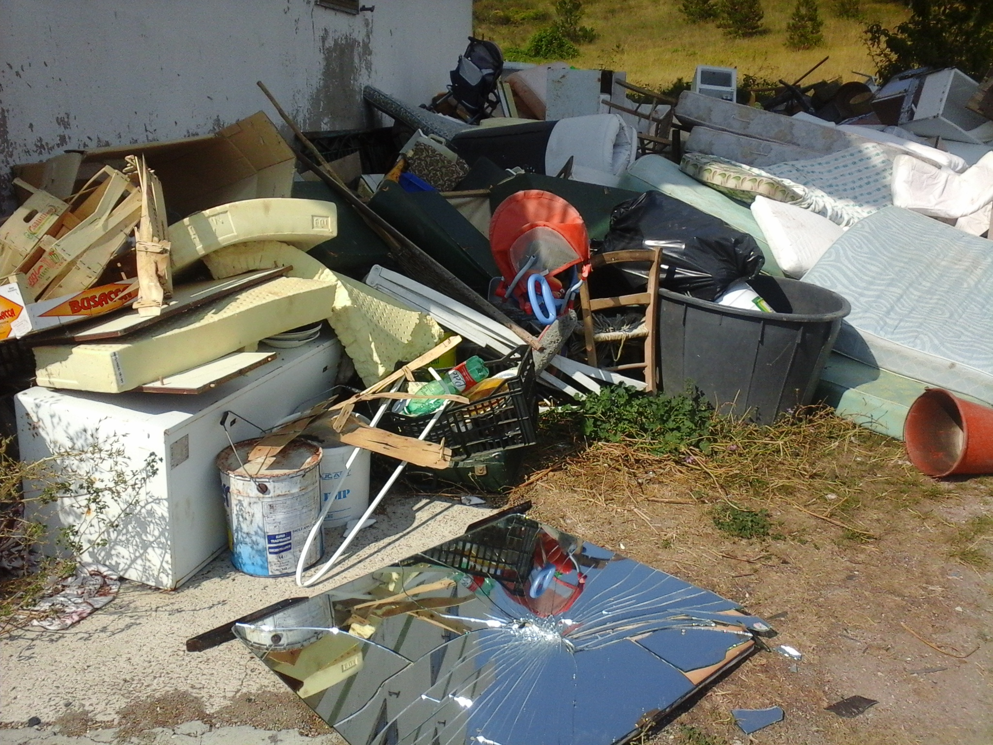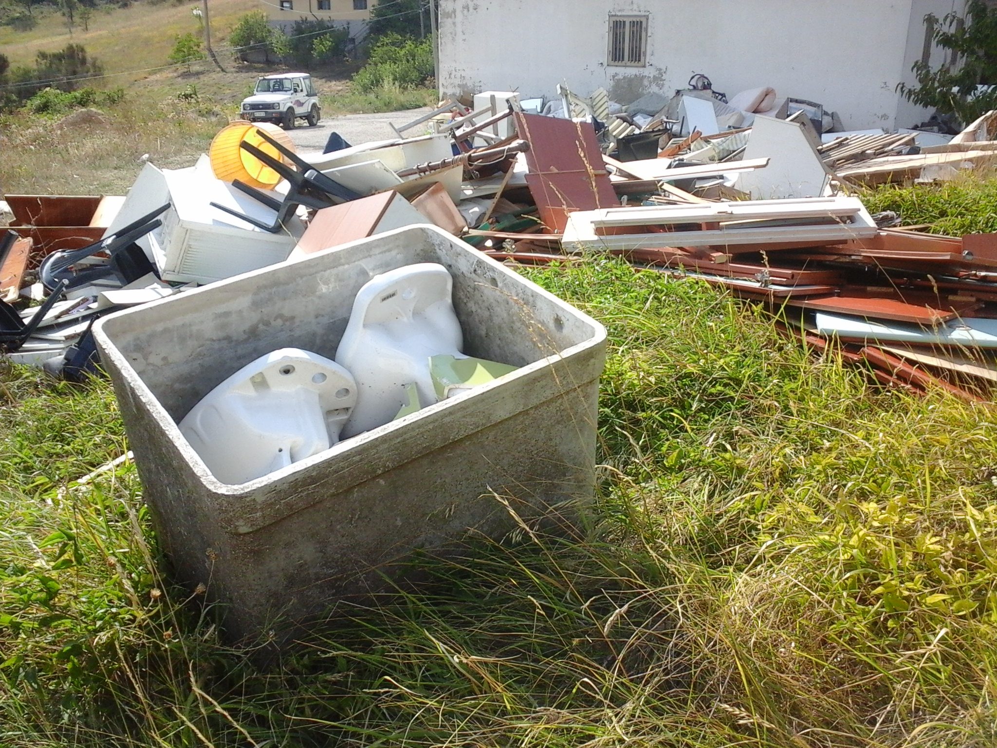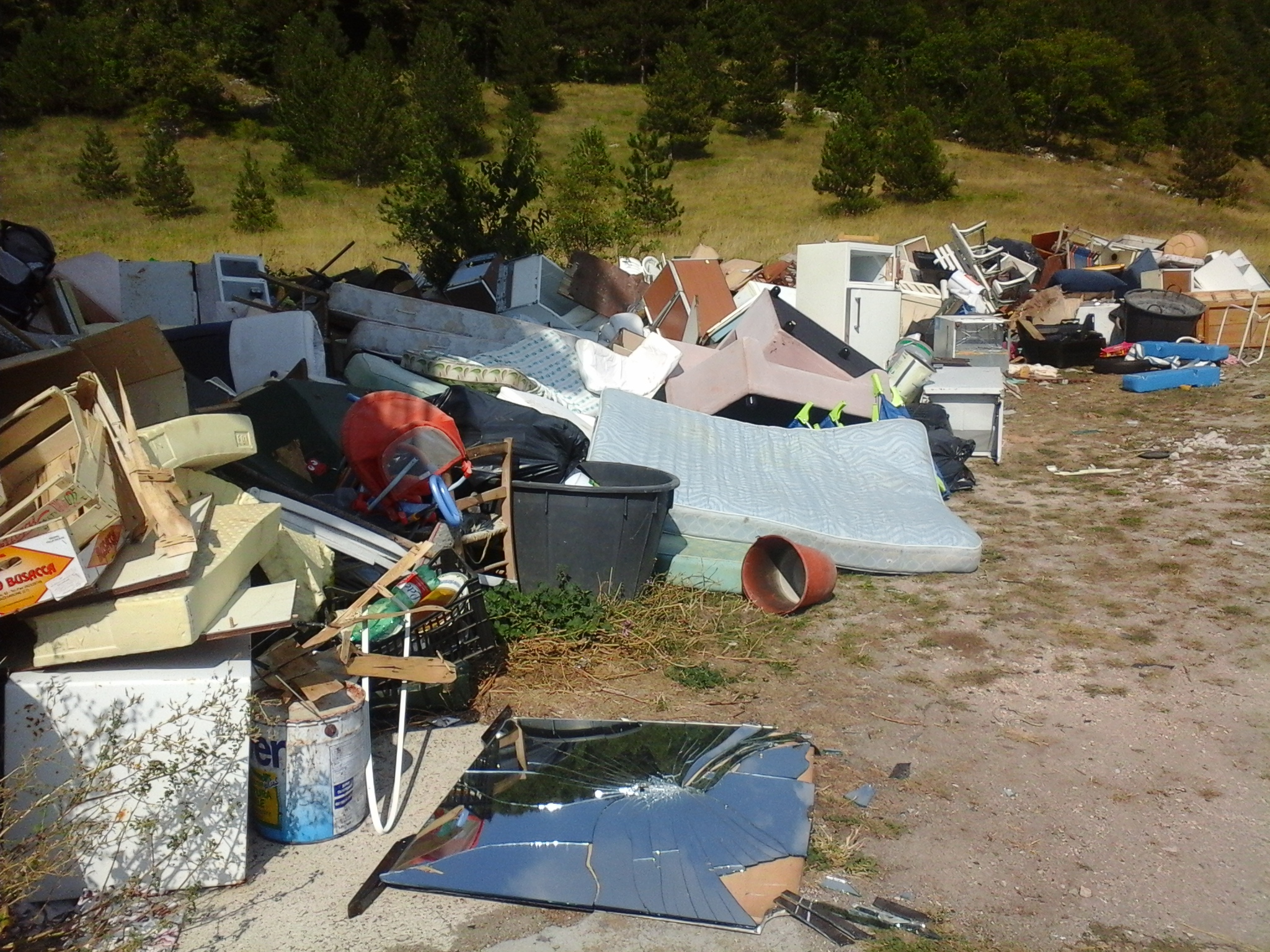 Rifiuti speciali e inquinanti, ingombranti, elettrodomestici, pneumatici, legno, vetro, plastica, materiale elettrico ed elettronico, di tutto, addirittura un grosso contenitore in eternit. Il tutto abbandonato nell’ambiente, ai piedi della pineta del Monte Pizzuto, accanto ad un fabbricato affittato al Comune da un privato.