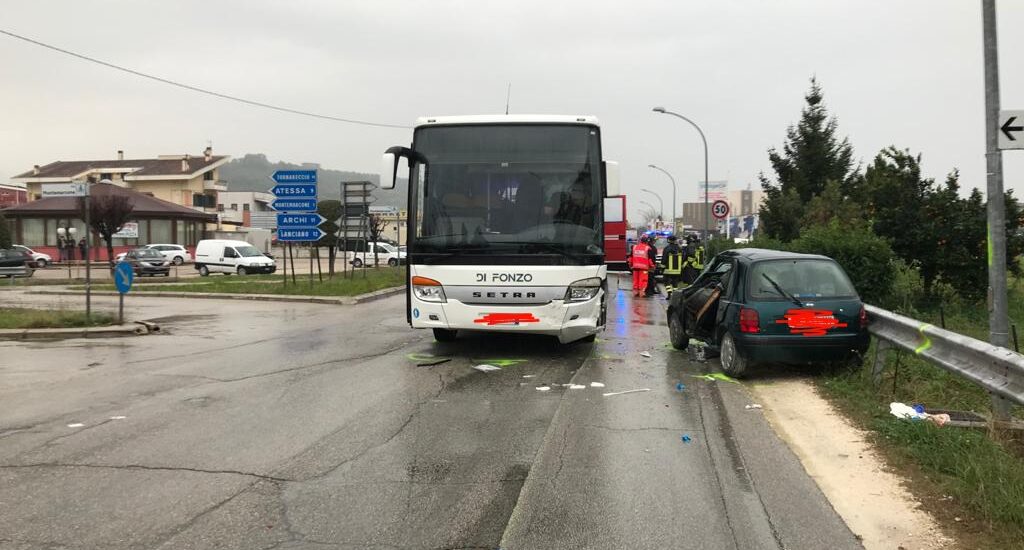 L’incidente intorno alle ore 6,50 a Montemarcone, frazione di Atessa. Coinvolti un autobus della ditta “Di Fonzo” partito da Castiglione Messer Marino e diretto a Pescara, condotto da un 56enne di Castelguidone, e una Nissan Micra condotta da un 76enne di Atessa. Secondo le prime ricostruzioni la Micra, mentre si immetteva sulla Sp 119 ad un incrocio, è stata urtata lateralmente dall’autobus. L’anziano è stato soccorso e trasferito in ospedale a Pescara dove attualmente è ricoverato in prognosi riservata. I mezzi sono stati sequestrati dai Carabinieri dipendenti dalla compagnia di Atessa, al comando del capitano Alfonso Venturi.