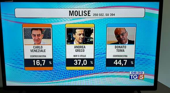 Scrutinato oltre il 50% delle sezioni, nelle elezioni regionali del Molise la coalizione del centrodestra guidata da Donato Toma resta in testa col 45% dei voti. Segue il Movimento 5 stelle rappresentato da Andrea Greco, col 37% delle preferenze. Indietro il centrosinistra di Carlo Veneziale, al 16,5%.