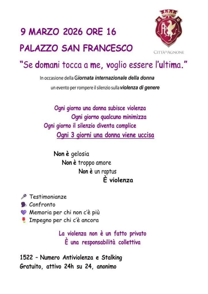 L’assessore comunale al sociale del Comune di Agnone, Enrica Sciullo, in occasione della giornata internazionale della donna, lancia un evento per «rompere il silenzio sulla violenza di genere». “Se domani tocca a me, voglio essere l’ultima” è il titolo scelto per l’iniziativa di sensibilizzazione che si terrà presso palazzo San Francesco domani pomeriggio, dalle ore 16.