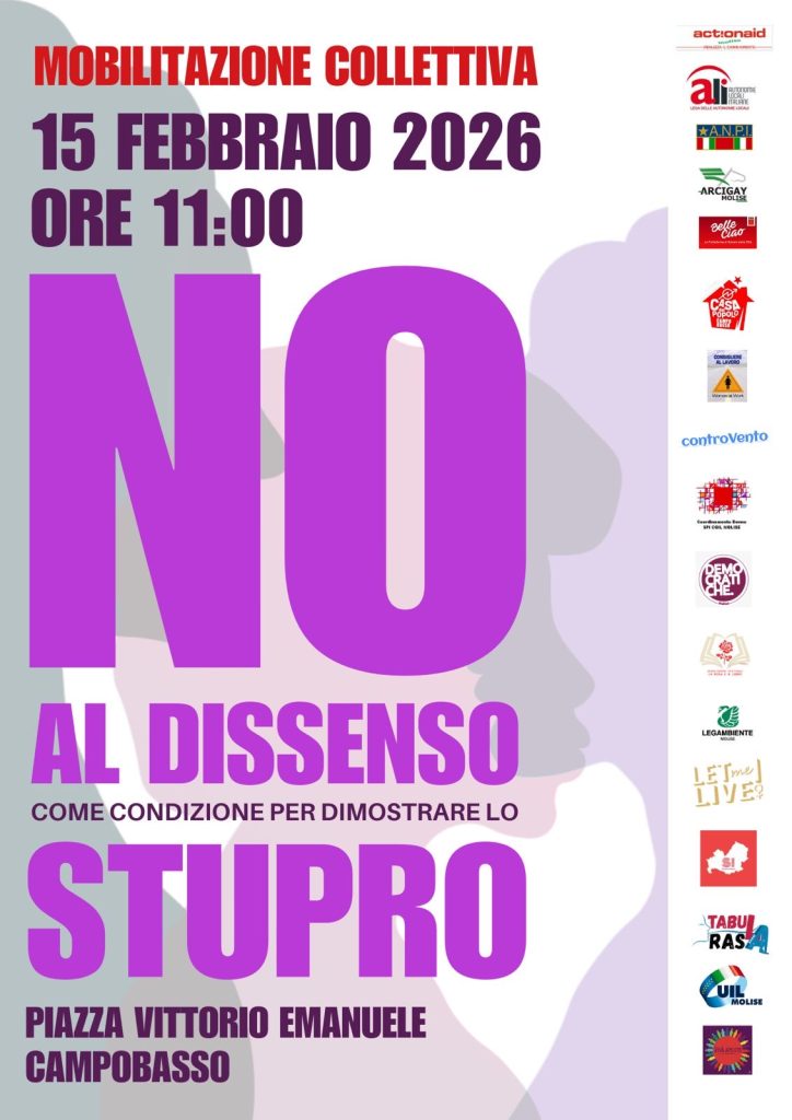 La Conferenza delle Donne Democratiche del Molise aderisce e parteciperà alla mobilitazione collettiva in programma sabato 15 febbraio 2026, alle ore 11, in Piazza Vittorio Emanuele a Campobasso, per ribadire con forza un principio non negoziabile: senza consenso libero e attuale è stupro.