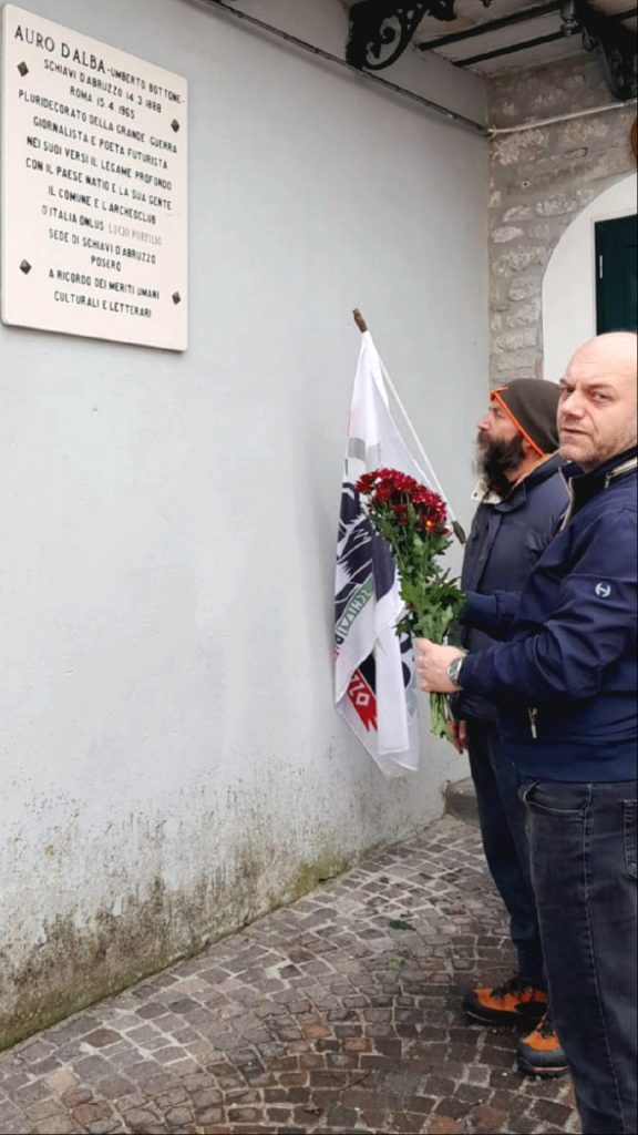 Una cerimonia privata, di famiglia, ma comunque sentita, quella che si tenuta nel pomeriggio di oggi a Schiavi di Abruzzo, in piazza Vittorio Emanuele, ai piedi della lapide commemorativa di Auro d’Alba, poeta futurista, soldato pluridecorato della prima guerra mondiale e successivamente console generale della Milizia.