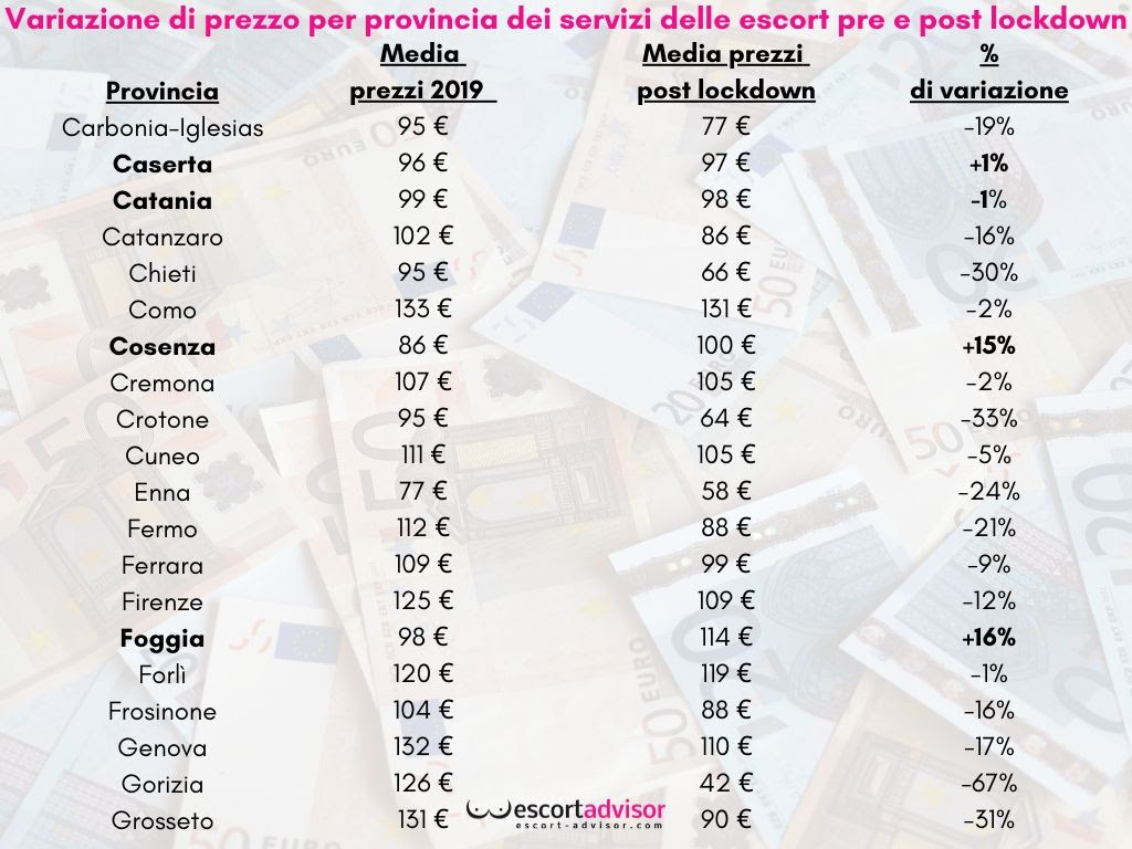 Nel post lockdown le escort abbassano i prezzi quasi in tutta Italia. Nella maggior parte delle province italiane, infatti, le tariffe delle professioniste del sesso hanno subito delle oscillazioni. Escort Advisor, il sito di recensioni di escort più visitato in Europa con oltre 2 milioni e 300 mila utenti mensili solo in Italia, ha verificato questa tendenza con i dati raccolti attraverso le recensioni degli utenti che confermano o smentiscono le tariffe dichiarate dalle escort nei loro annunci.